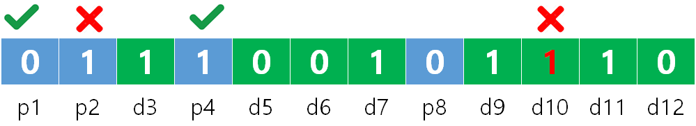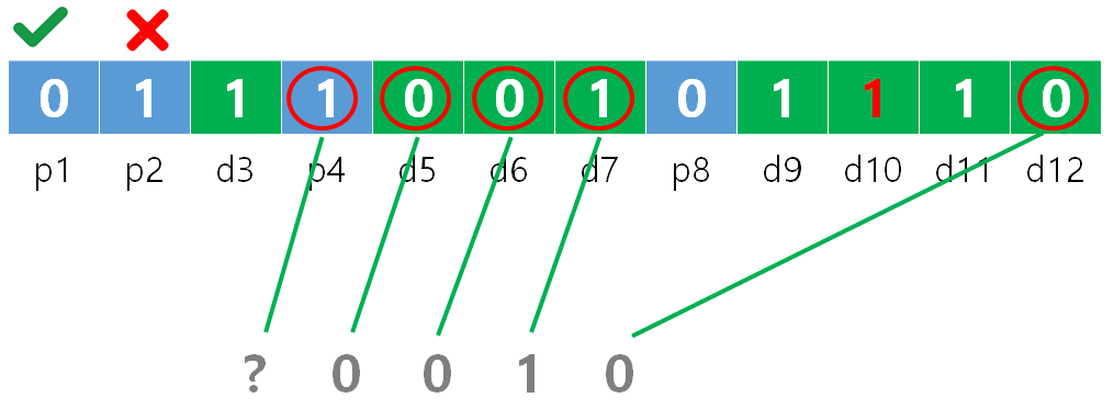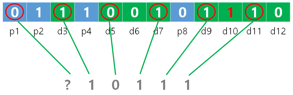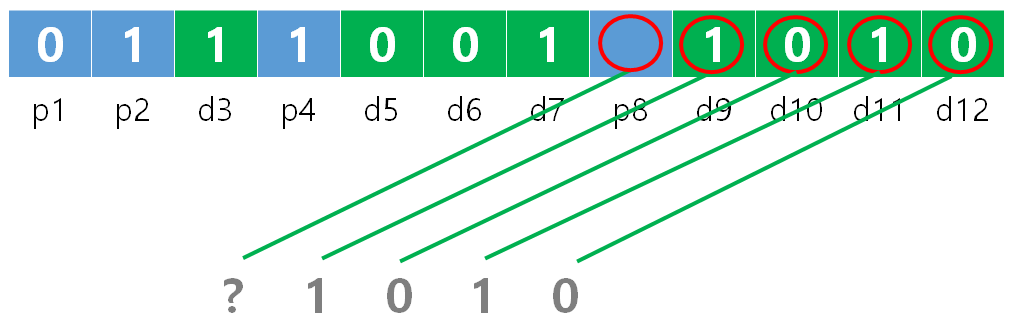 P8 = XOR 비트 그룹 (9, 10, 11, 12) = 0 ⊕ 1 ⊕ 0 ⊕ 0 = 1