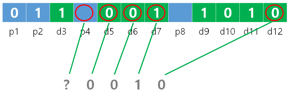 P4 = XOR 비트 그룹 (5, 6, 7, 12) = 1 ⊕ 0 ⊕ 0 ⊕ 0 = 1