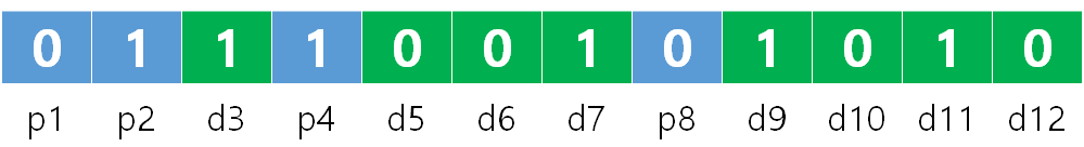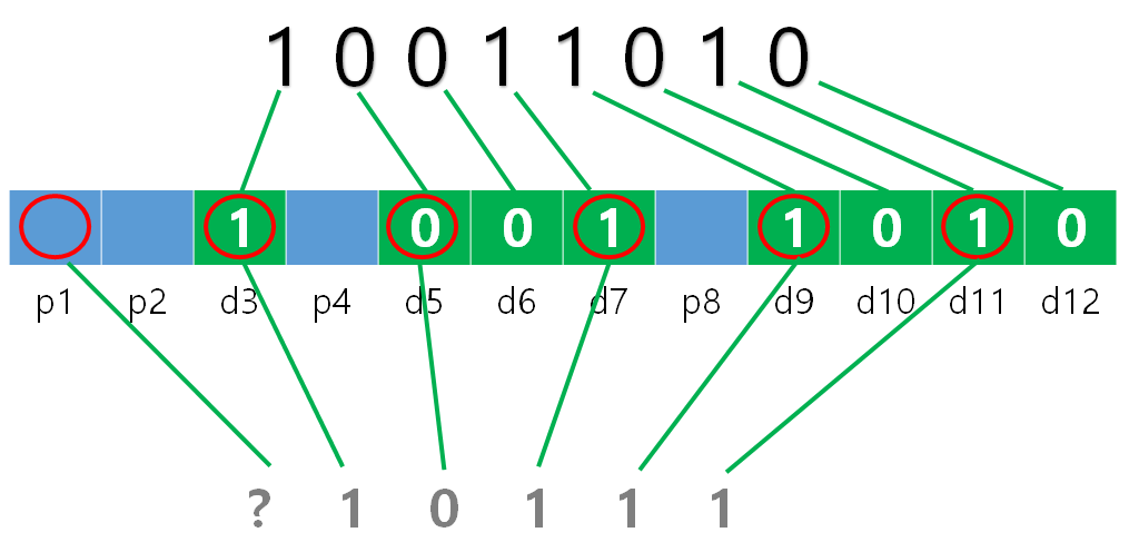네 개의 패리티 비트 P1 P2 P4 P8의 위치는 1, 2, 4, 8이며 데이터어 8 비트는 나머지 위치에 있다.