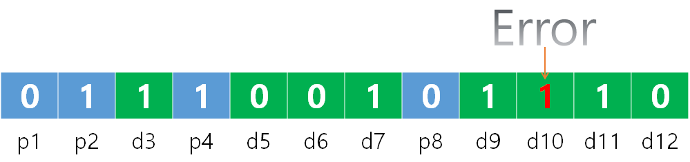 p2, p8이 잘못된 값이므로 2 + 8 = 10인 10번째 비트에서 오류가 발생한 것을 검출하였다.