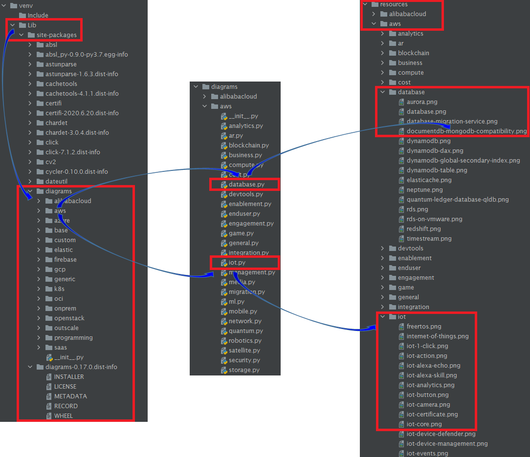 즉, diagrams.aws.database와 diagrams.aws.iot를 임포트하면 \venv\Lib\site-packages\diagrams\aws 경로에 있는 database.py와 iot.py의 소스를 포함한다.