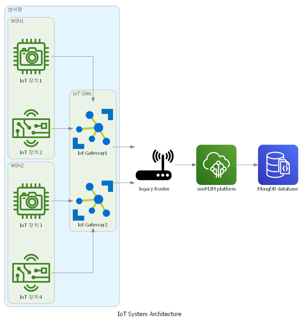 이 코드는 IoT 장치 2개당 1개의 IoT Gateway에 연결되고 GW들은 기존 라우터에 연결되어 IoT 플랫폼을 통해 몽고 데이터베이스에 데이터가 적재되는 시스템이다.