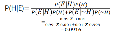 양성 판정(사건 E)인 사람이 암에 걸릴(사전 확률 H) 사후 확률 P(H|E)는 9%가 된다.