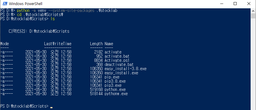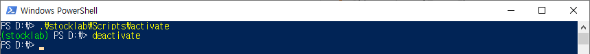 | 파이썬 활성화 및 비활성화 | D:\> .\stocklab\Scripts\activate (stocklab) D:\> deactivate |