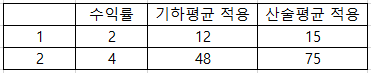 산술평균을 적용한 값이 기하평균을 적용한 값보다 크며, 정확한 값은 기하평균을 적용해야 구할 수 있다.