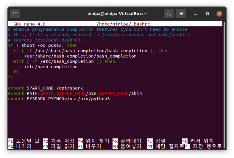 | ninipa@ninipa-VirtualBox:~$ nano ~/.bashrc 아래 3 줄 추가 export SPARK_HOME=/opt/spark export PATH=$PATH:$SPARK_HOME/bin:$SPARK_HOME/sbin export PYSPARK_PYTHON=/usr/bin/python3 |