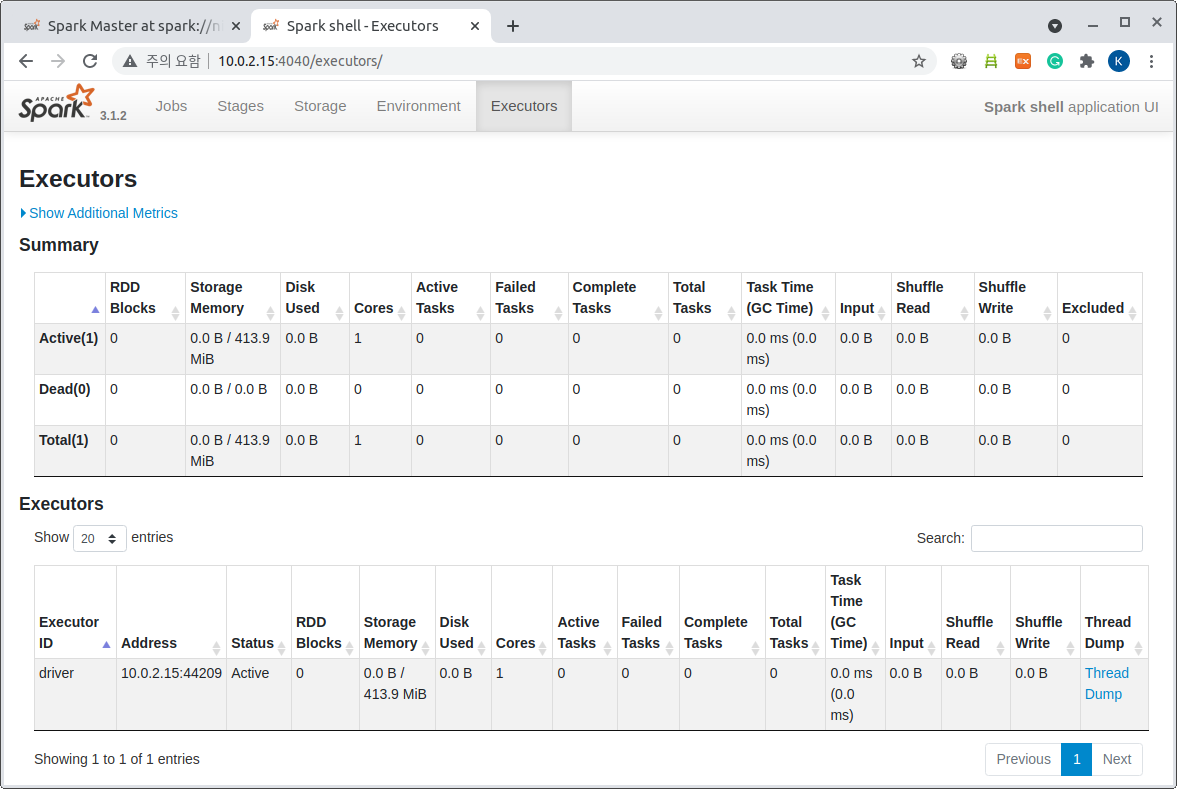 Spark 실행 후 브라우저에서 master와 worker의 Web UI 실행한 내용은 아래와 같다.