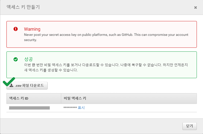 액세스 키가 만들어지고 팝업 창이 나타나면 [.csv 파일 다운로드]를 눌러 생성된 액세스 키를 다운로드 한다.