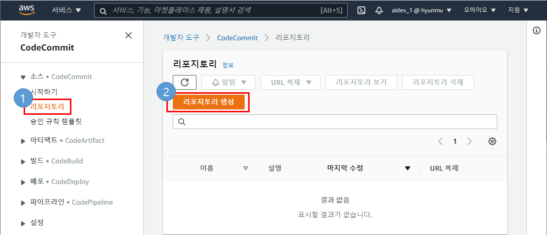 CodeCommit 콘솔에서 '리포지토리 생성'을 눌러 저장소를 생성한다.