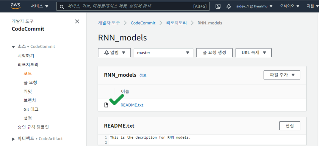 AWS CodeCommit에 로컬 컴퓨터에서 업로드한 파일이 추가되었다.