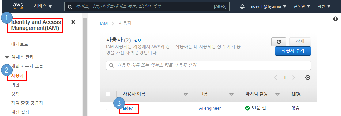 이 액세스 키 ID와 비밀키는 로컬 컴퓨터에서 사용하므로 잘 보관한다.