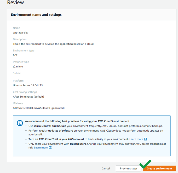 검토 페이지에서 Create environment(환경 생성)를 선택해 AWS Cloud9 환경을 생성한다.
