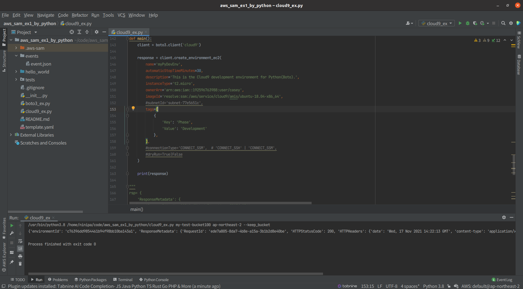 | response = client.create_environment_ec2( name='myPyDevEnv', automaticStopTimeMinutes=30, description='This is the Cloud9 development environment for Python(Boto).', instanceType='t2.micro', ownerArn='arn:aws:iam::123456789012:user/username', imageId='resolve:ssm:/aws/service/cloud9/amis/ubuntu-18.04-x86_64', subnetId='subnet-77e5651c', tags=[ { 'Key': 'Phase', 'Value': 'Development' }, ], ) |