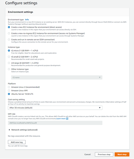 4. 이름과 설정 구성 (Configure settings)을 선택하고 EC2 지원 환경을 생성한다.