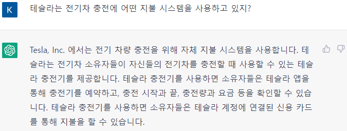 추가로 테슬라가 사용하는 지불 시스템을 한글로 문의했더니 한글로 답변이 나왔다. 한글로도 답변이 가능하구나!