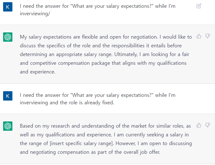 일단 질문은 영어로 해보았다. 답변이 상세하게 타이핑된다. 답변이 마음에 들면 엄치 척을 눌러 평가할 수 있다.