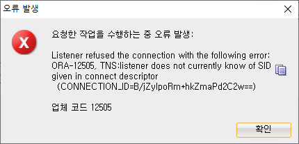 - 데이터베이스 종료 후 SQL developer로 접속을 시도하면 다음과 같은 오류가 난다.