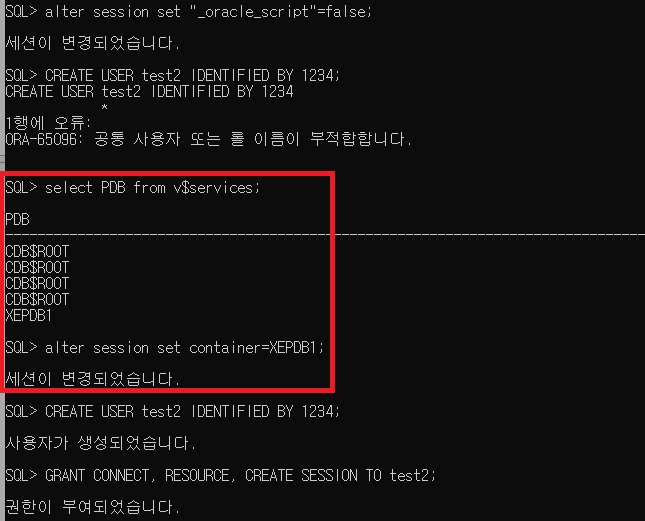 XEPDB1 데이터베이스에 test2 계정을 생성하고 권한을 부여하였다.