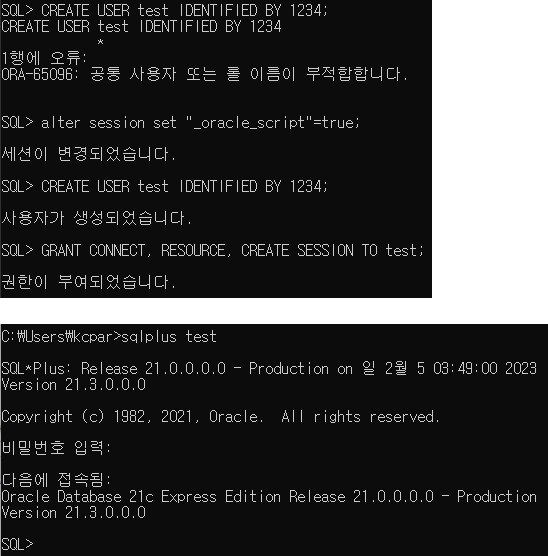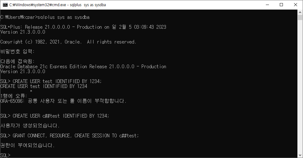 Oracle Database 21c XE 사용하려면 다음과 같이 사용자 계정을 생성해야 한다.