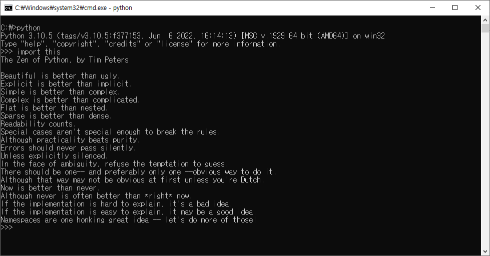 파이썬 인터프리터에서 "import this"를 입력하면 Zen of Python이란 철학적인 글을 볼 수 있다.