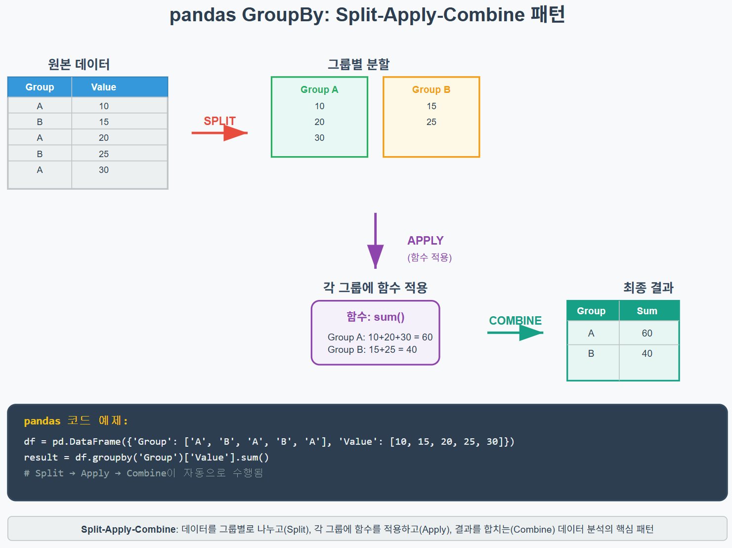 pandas.DataFrame.groupby() (또는 Series.groupby())는 Split‑Apply‑Combine 패턴을 구현한 핵심 메서드이다.