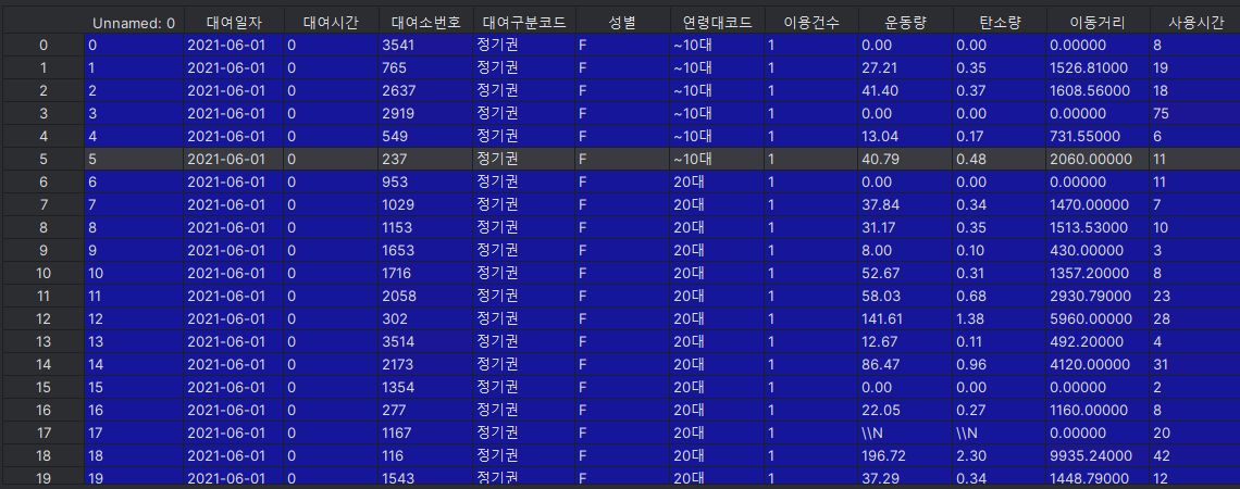 아래 그림은 서울 공유자전기 따릉이에 대한 사용 정보를 가진 데이터셋의 일부이다.